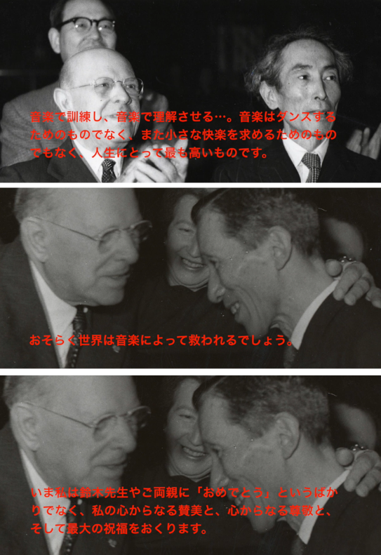カザルスが初来日した1961年4月、東京・文京公会堂で400人のスズキの子どもたちの合奏を聴き、感動さめやらぬままスピーチをしました。