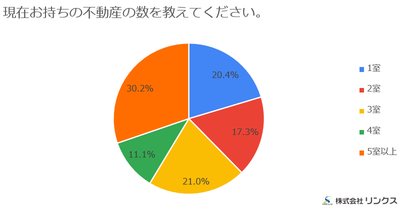 また、現在保有している不動産の数を聞いたところ、5室以上が30%と最多となりました。1室~4室と回答した保有者も一定数おりますが、1室ではなく複数の不動産を持ち運用していることが伺えます。