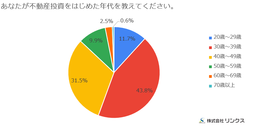 不動産投資をはじめた年代を聞いたところ、30代が最多の43.8%、次点が40代で31.5%という結果になりました。30代以上で開始したのが、全体の約9割という結果となり、20代でスタートしたのは少数の11.7%となりました。