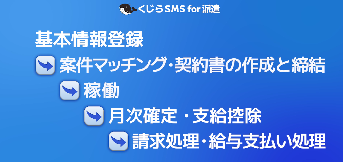 「くじらSMS for 派遣」は、求人媒体管理、スタッフ管理、クライアント管理、引当案件管理、勤怠管理、請求管理、給与管理、労務管理、契約書管理など、人材派遣に関わるあらゆる管理作業を一つのプラットフォームで効率的に行えることが最大の特徴です。