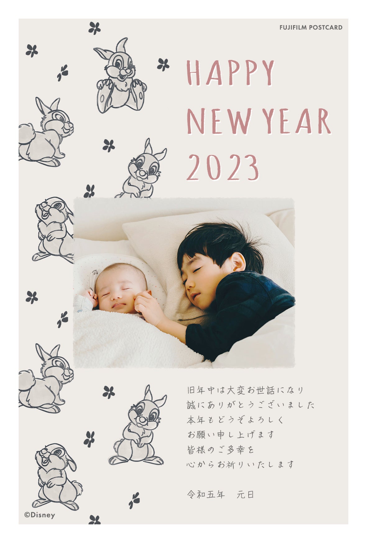 年賀状デザインとして毎年人気である「干支」にちなんだ動物の柄。 「スマホで年賀状 2023」では、『バンビ』の「とんすけ」、『ふしぎの国のアリス』の「白うさぎ」、といったおなじみのウサギキャラから『ズートピア』の「Judy(ジュディ)」などディズニーの中でも人気の高いうさぎのキャラクターを幅広く使用したデザインを多数ご用意。年賀状ならではの和風なデザインから、写真と組み合わせて楽しいデザイン、優しい色合いのデザインなど、それぞれフォトフレームタイプと写真なしタイプの10種、合計20バリエーションをご用意しました。