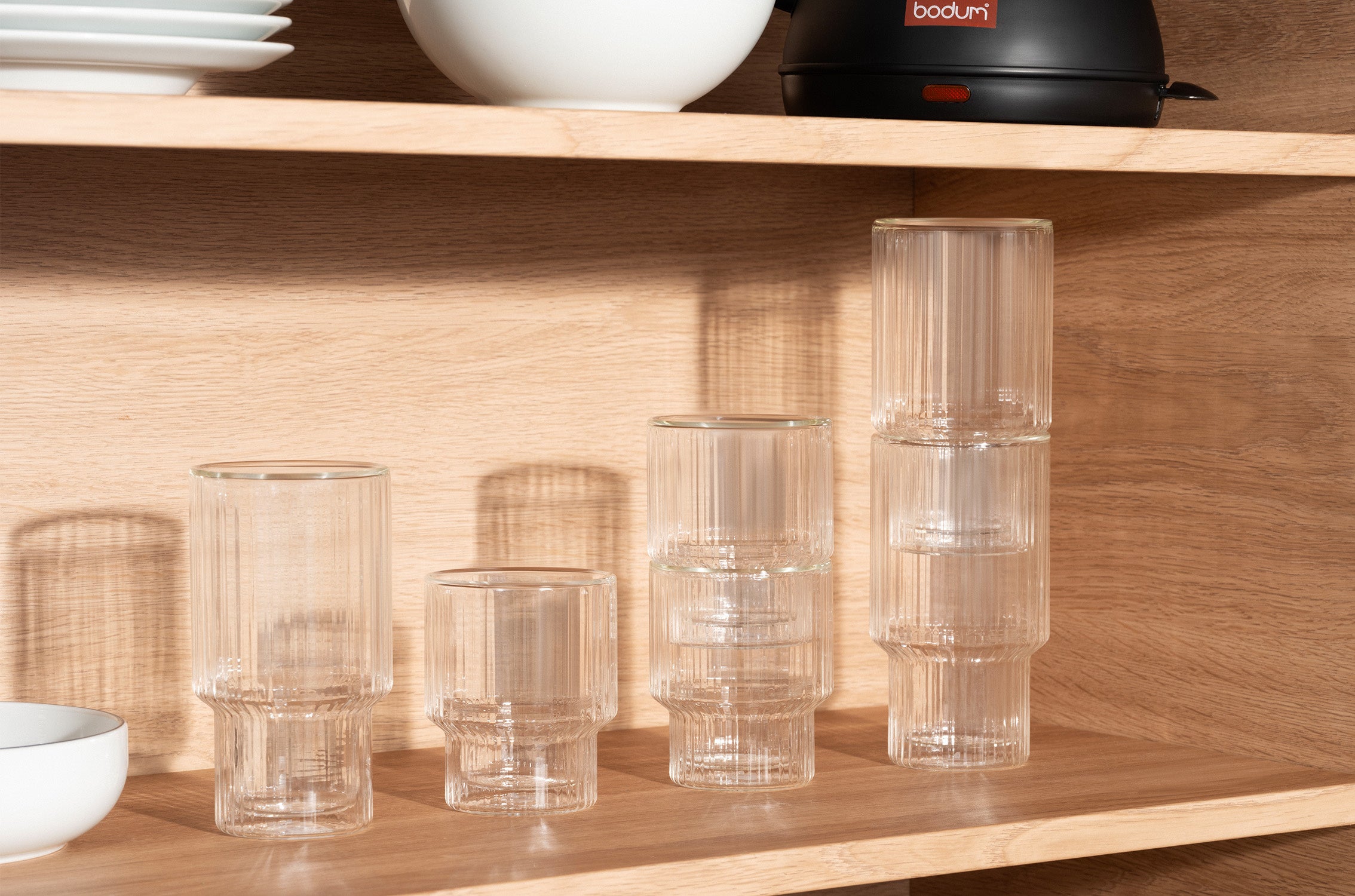 NAVALIA ダブルウォールグラスは、サイズを問わず、積み重ねができる機能的なデザインで、キャビネットの隙間にすっぽりと収まります。