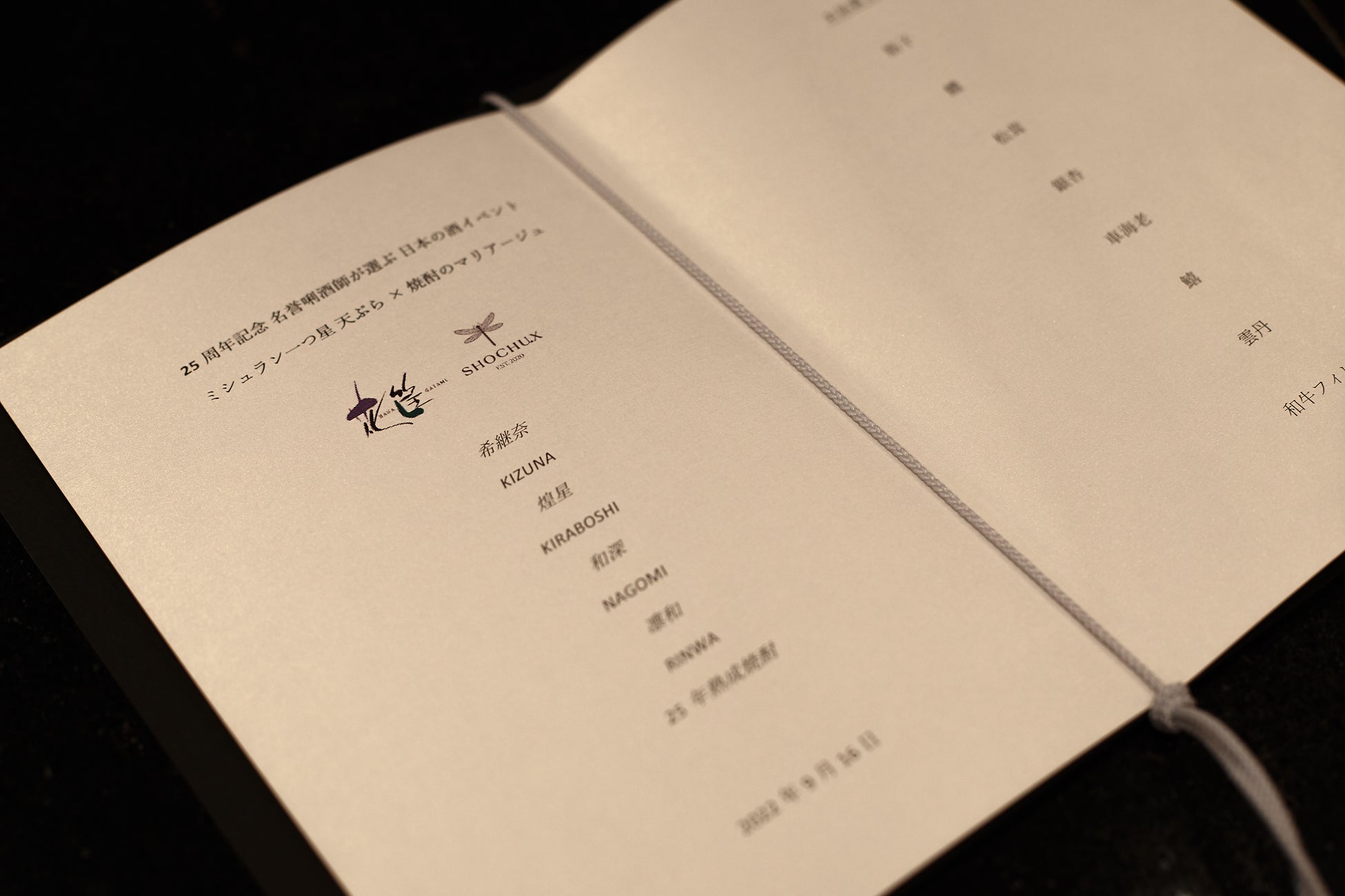 SHOCHU Xの商品である「希継奈(きずな)」「煌星(きらぼし)」「和深(なごみ)」「凜和(りんわ)」の4種類の説明を聞きながら、「ミシュランガイド京都・大阪2023」で一つ星店として掲載された「花筐」深名料理長の贅沢な一品一品をゲストに召し上がっていただきました。同日にリリースとなり、販売日には6分で売切となった25年熟成「NK麦025」を〆の食後酒として、25周年記念の貴重なイベントに華を添えることができました。また、ザ・リッツ・カールトン大阪ではSHOCHU Xの商品を導入いただいておりますので、引き続きSHOCHU Xの商品をお楽しみいただくことが可能です。