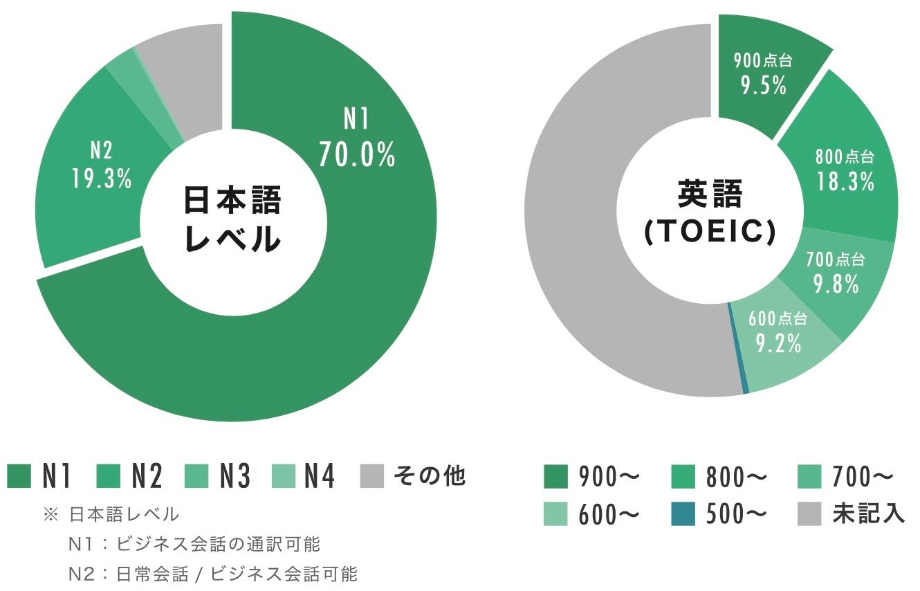 英語力についても、全体の約45%TOEIC600点以上を保有しており、トリリンガルの人材も多数登録しております。