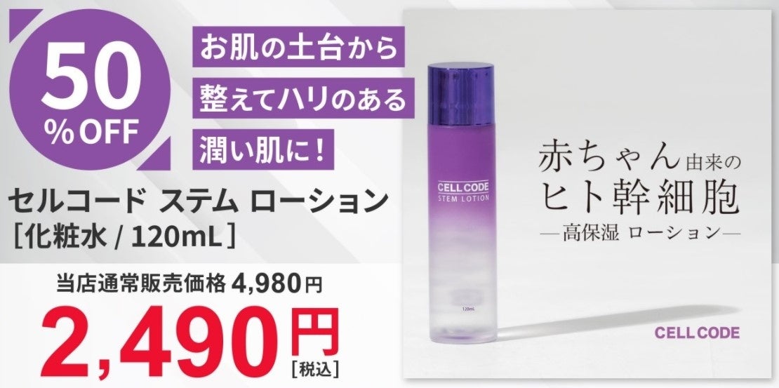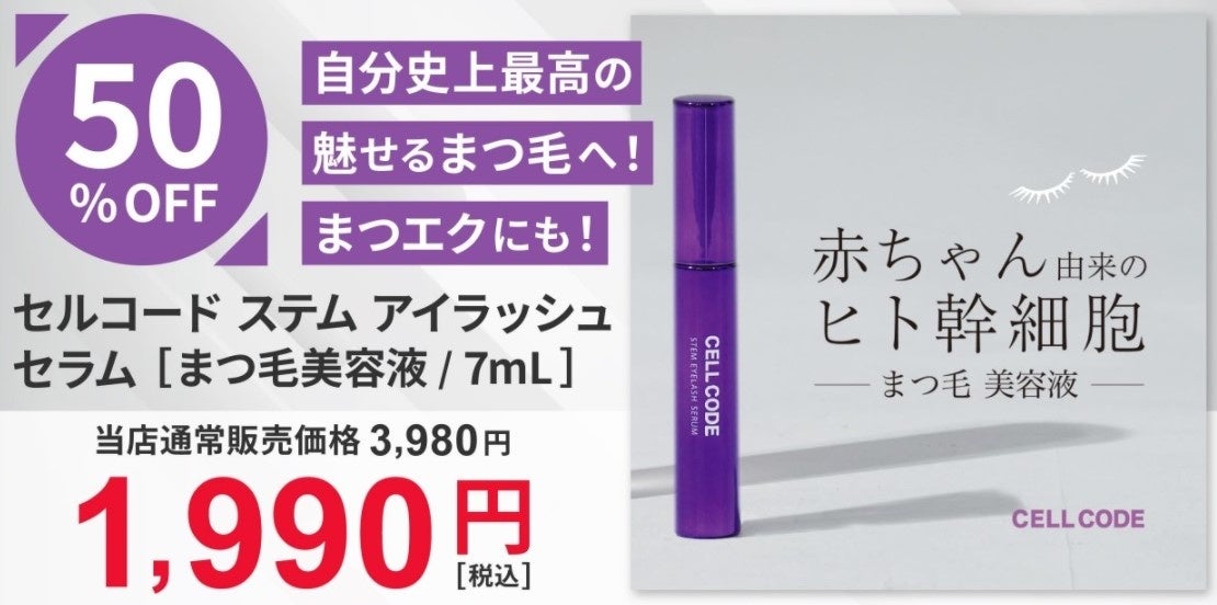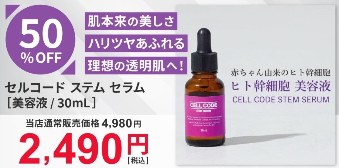 再生医療から生まれた「ヒト臍帯血幹細胞由来培養上清液*」を配合したセルコードシリーズ(化粧水・美容液・まつ毛美容液)が、楽天大感謝祭では、最大50%OFFの特別価格にてお買い求めいただけます。