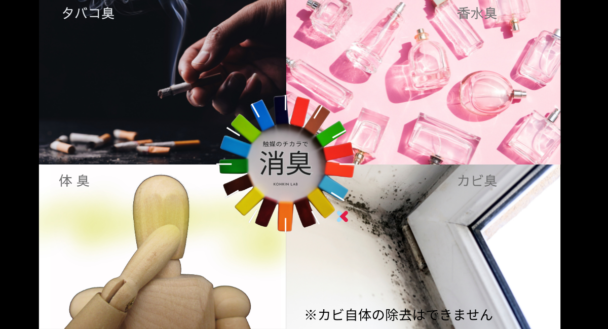 3種の触媒とは、プラチナコロイド・銀コロイド・酸化チタンを主成分とした抗菌・抗ウイルス・消臭剤です。空間全体を飽和状態にさせ、室内全体に触媒を定着させることにより異臭を分解・消臭させることを実現しました。