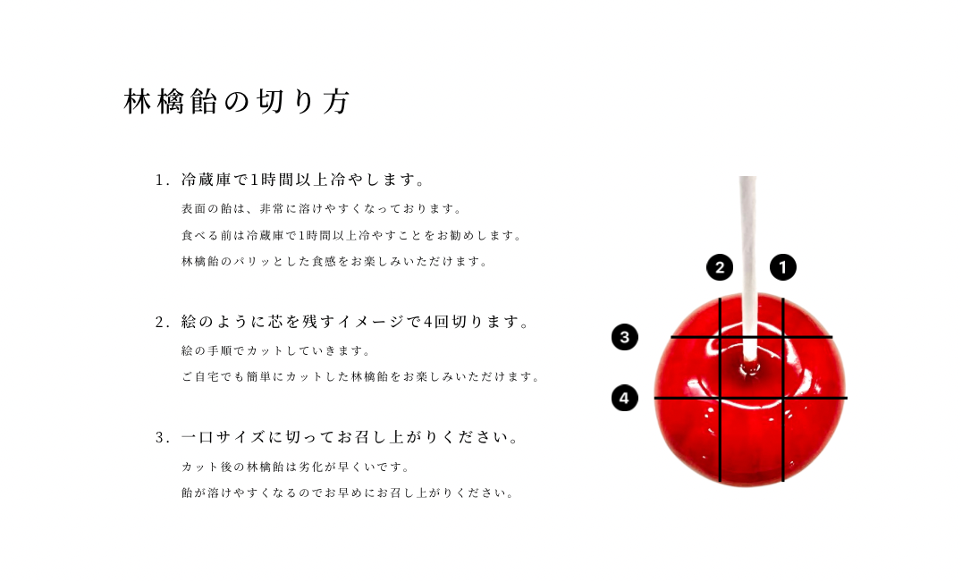 「あくまで主役は林檎。」なので、飴のコーティングを可能な限り薄くしています。飴のパリパリ感を最大に引き出す為に、数種類の砂糖を絶妙な配分で配合して作っています。
