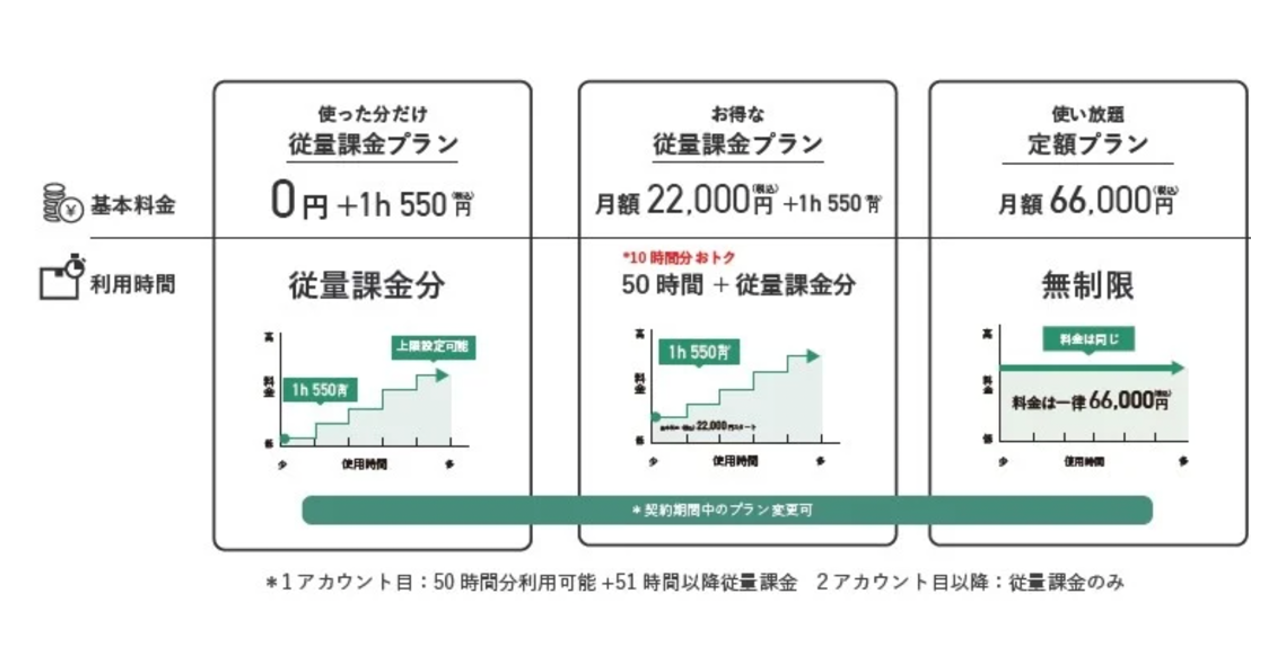 プランは大きく3つあり、「定額プラン」「50時間分利用可能の従量プラン」「自社設置BOXの定額プラン」となっております。