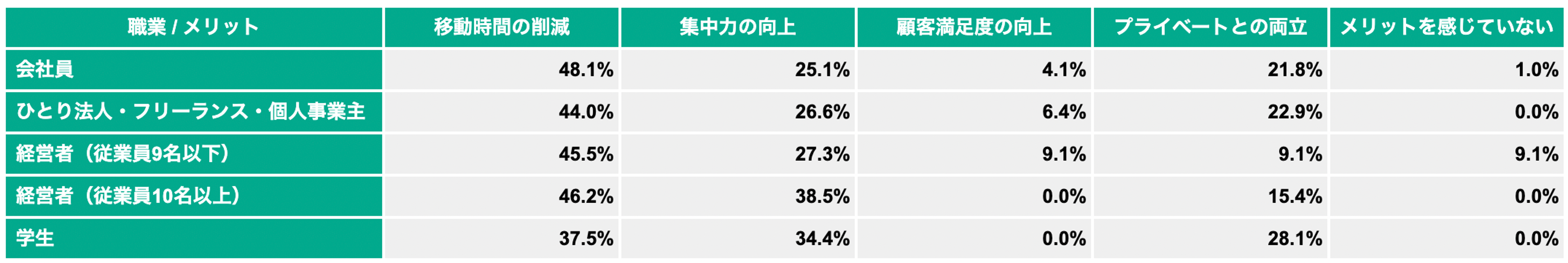 会社員こそ、外出時のテレワーク時は「移動時間」の削減。そして「集中時間」を求めている。