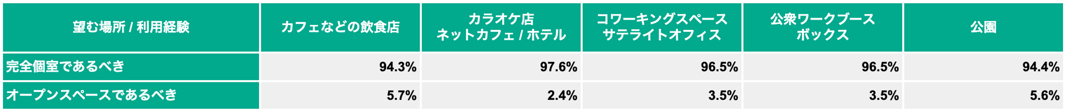 また外出先のテレワーク場所別に望ましい外出時のテレワーク場所を聞くと、95%以上が完全個室を望んでいることがわかった。前述の外出時のテレワークのデメリットの上位であった周囲の音で集中できる環境と情報漏洩リスクの回避を強く求めているのではないかと推察される。