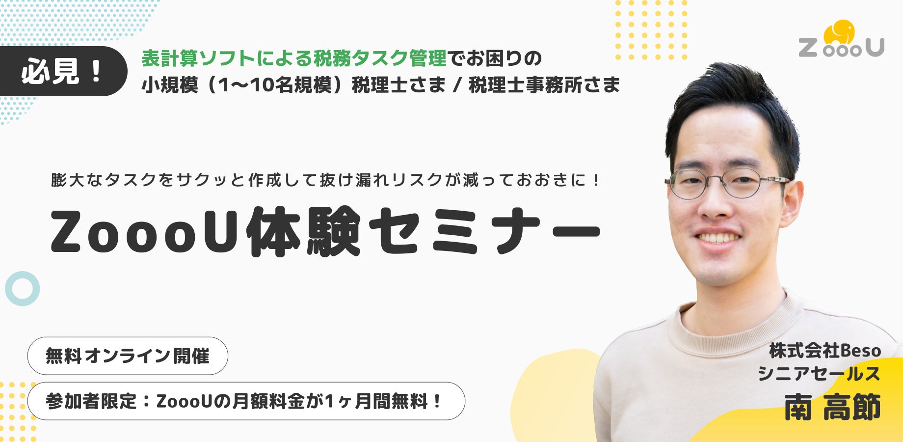 『税理士が「顧問業務の本質的な税務相談」に集中できる環境を整えること』をバリューのひとつとするわたしたちは、ZoooU契約後の伴走にとどまらず、導入検討段階の無料トライアルにも伴走するべく、実際にツールを一緒に触り、実務への導入イメージをより具体的に体験することが可能なセミナーの開催をすることとなりました。