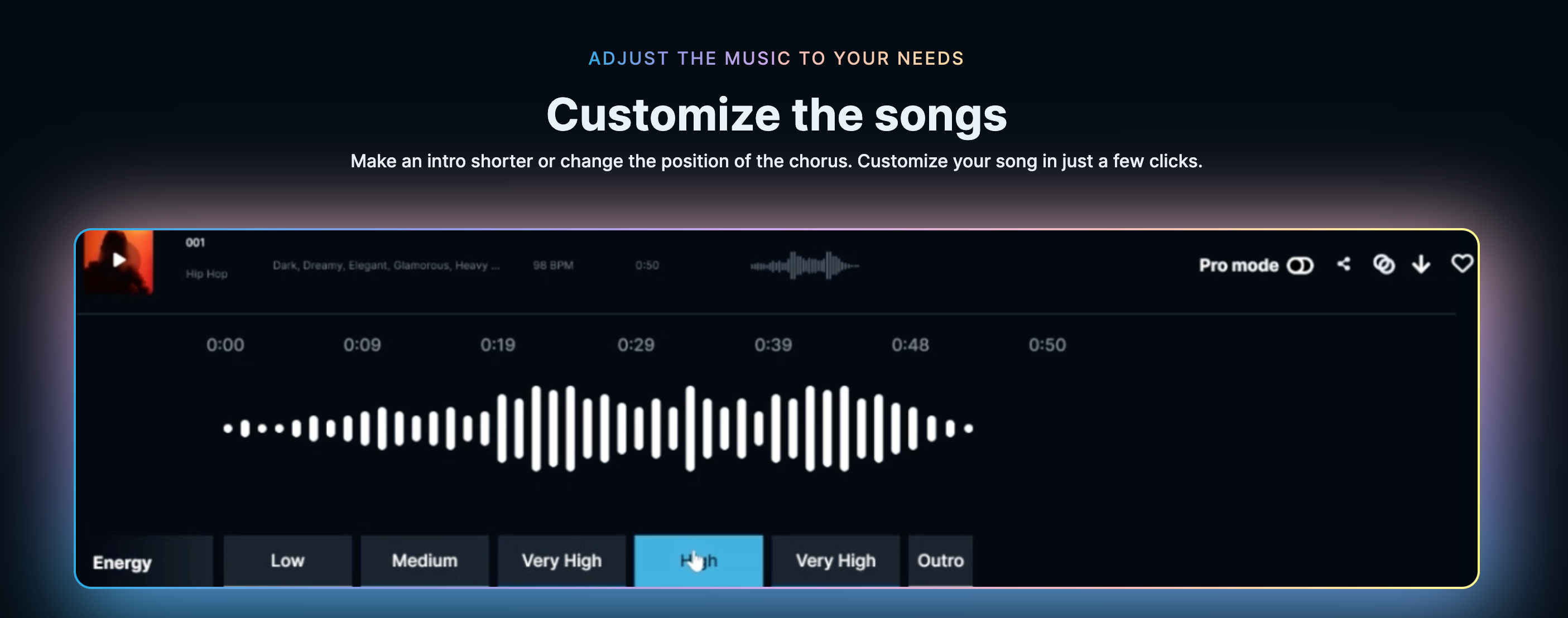 AIによって生成される無数のサウンドフレーズを組み合わせ、楽曲を自由に作り出すことができるWebサービスです。楽曲の尺・構成・楽器・テンポなど、自由にカスタマイズでき、会社PR動画、広告動画、YouTubeなど様々なコンテンツに合うオリジナルの著作権フリーな楽曲を作ることができます。音楽の知識やスキルがなくても、わずか数秒で15曲ほど作成することが可能です。