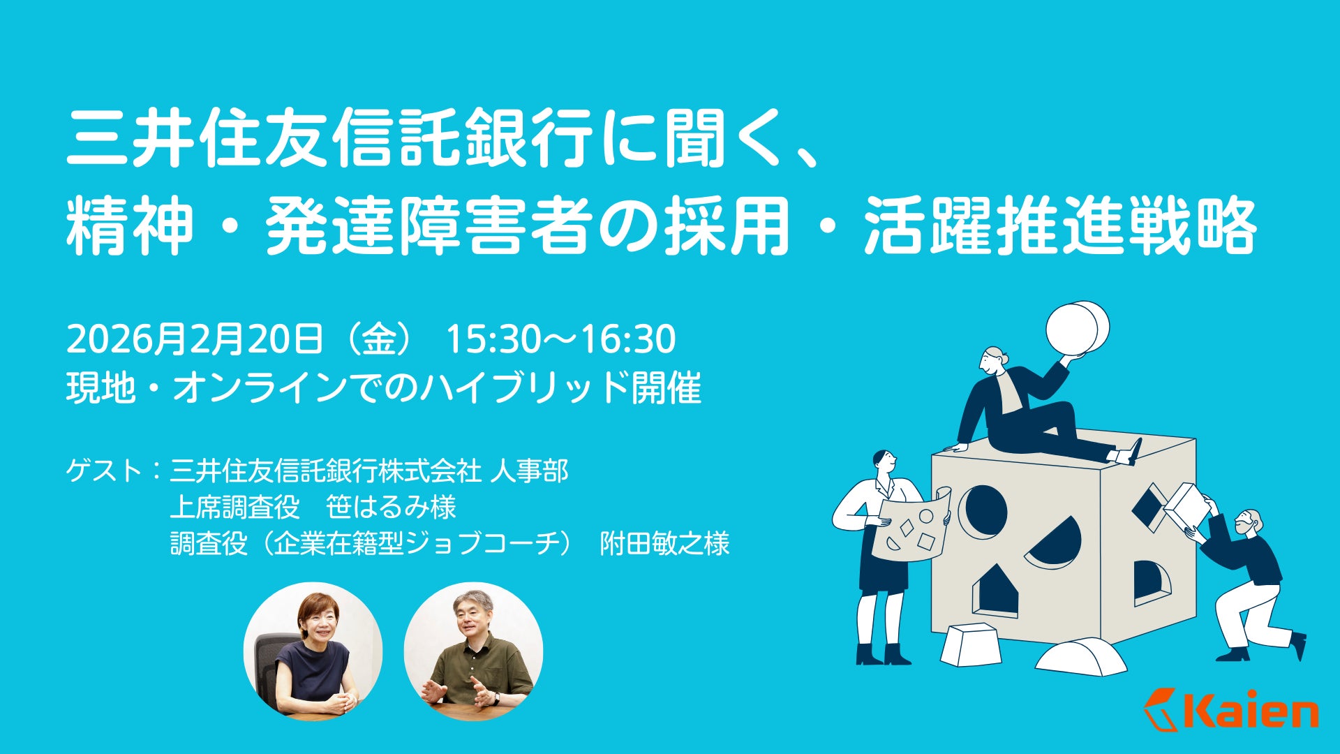 精神障害・発達障害の方への就労支援と、企業における障害者雇用のコンサルティング事業を展開する株式会社Kaien(本社:東京都新宿区、代表取締役:鈴木慶太、以下Kaien)は、三井住友信託銀行株式会社(以下、三井住友信託銀行)の人事部担当者をゲストに招いた無料セミナー「三井住友信託銀行に聞く、精神・発達障害者の採用・活躍推進戦略」を、2026年2月20日(金)に開催いたします。