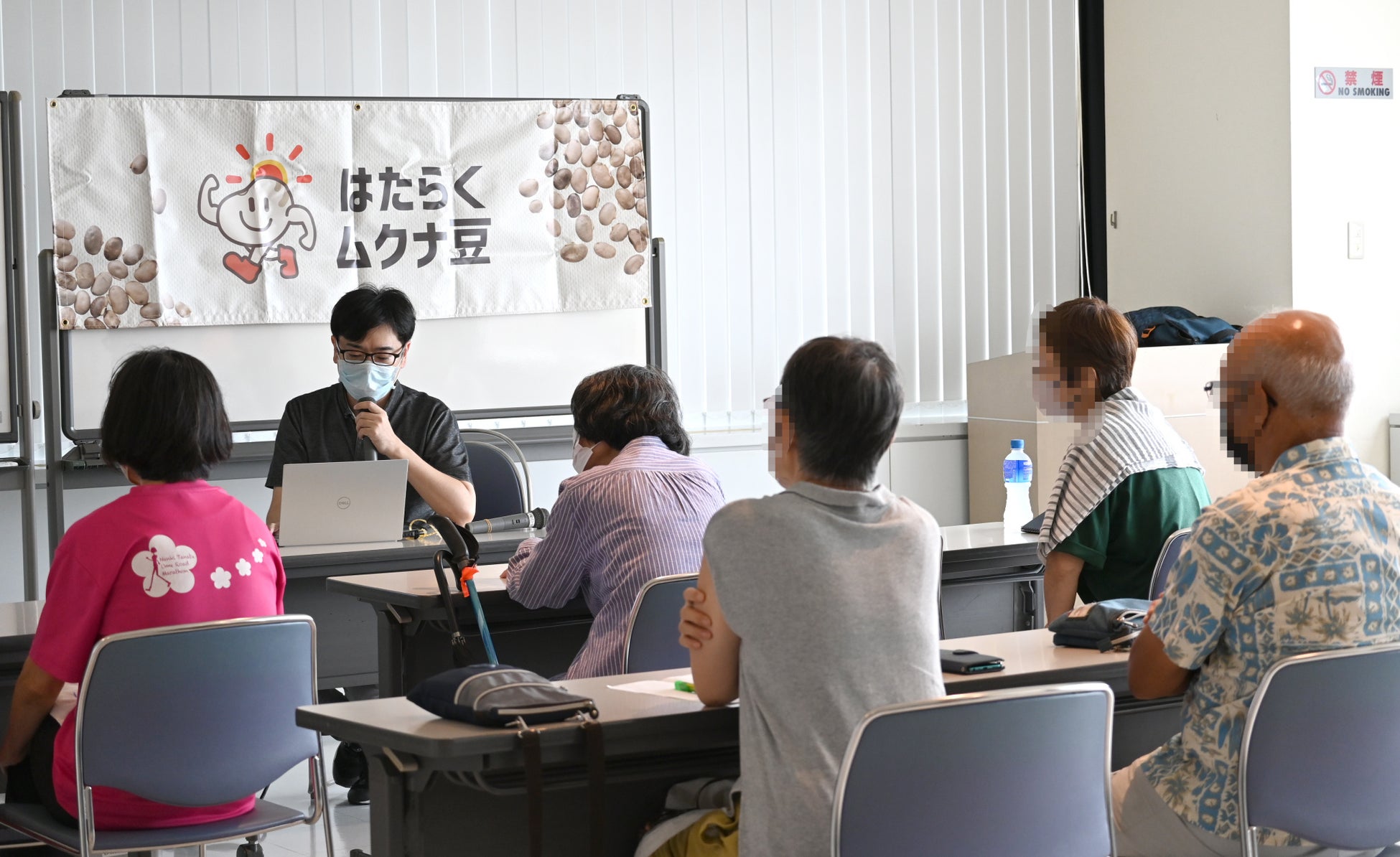 大阪河﨑リハビリテーション大学 河野 良平 講師が、加齢とともに健康な方でも減少するドーパミンと、ドーパミンの元である「L-ドーパ」が含まれるムクナ豆(八升豆)の健康効果について講演をおこないました。ドーパミンとムクナ豆の正しい知識の普及と認知拡大を狙いとし、参加者からはムクナ豆の利用方法について質問が飛ぶなど意見交換の場にもなりました。