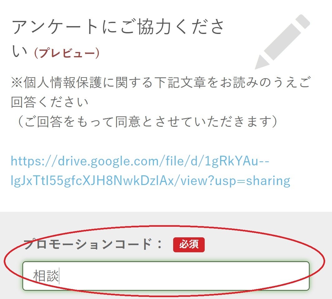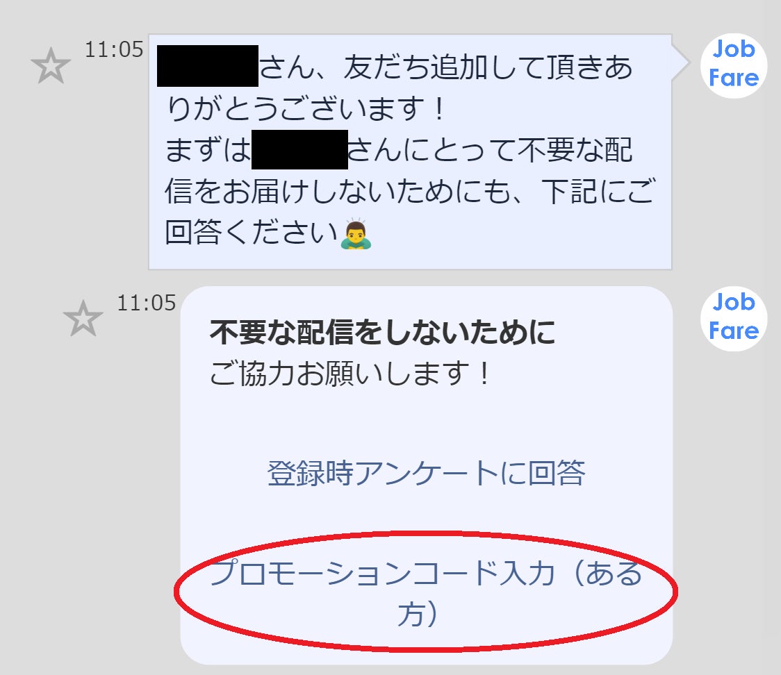 上記から友達登録をしていただくと、↓のような自動配信が流れますので、「プロモーションコード入力(ある方)」をタップいただき、その後のアンケートで必ずプロモーションコード「相談」を入力してください。