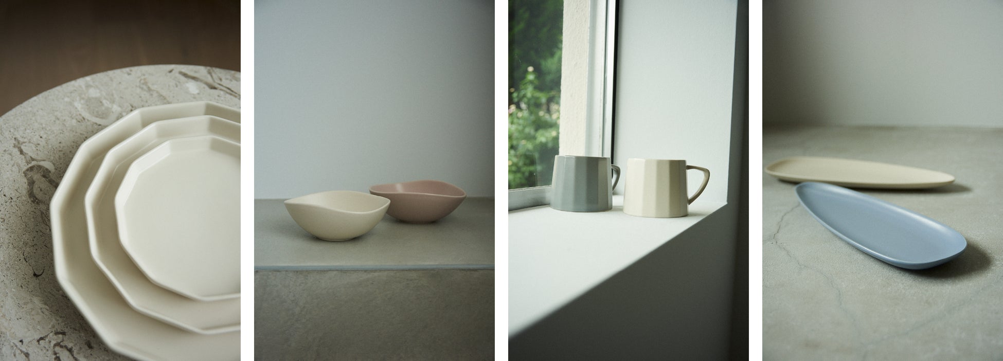 使いやすい大きさや形状に拘りデイリーに活躍するアイテムがラインナップ。カラーはアイボリーよりの明るいベージュを中心とし、差し色でくすみ系のカラーを展開。(MANOF×3COINS陶器シリーズ 330円〜880円)