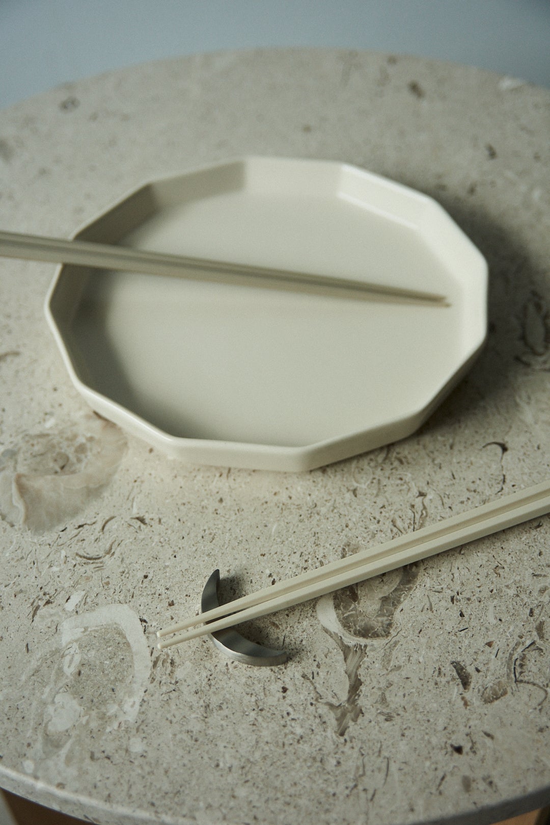 お箸はどんな料理にも合うベージュとグレーの4膳セット。(MANOF×3COINSカトラリー・箸・箸置き 各330円)