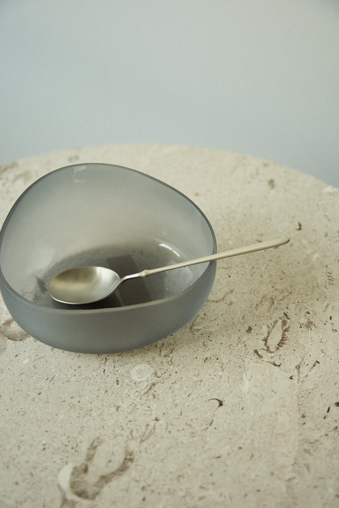 すりガラスのようなブルーグレーのカラーは、料理を高見えさせてくれます。マットな陶器シリーズと組み合わせることでテーブルコーディネートに奥行き感を演出。(MANOF×3COINSガラスシリーズ330円〜550円)