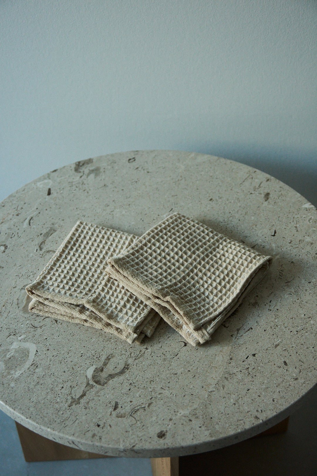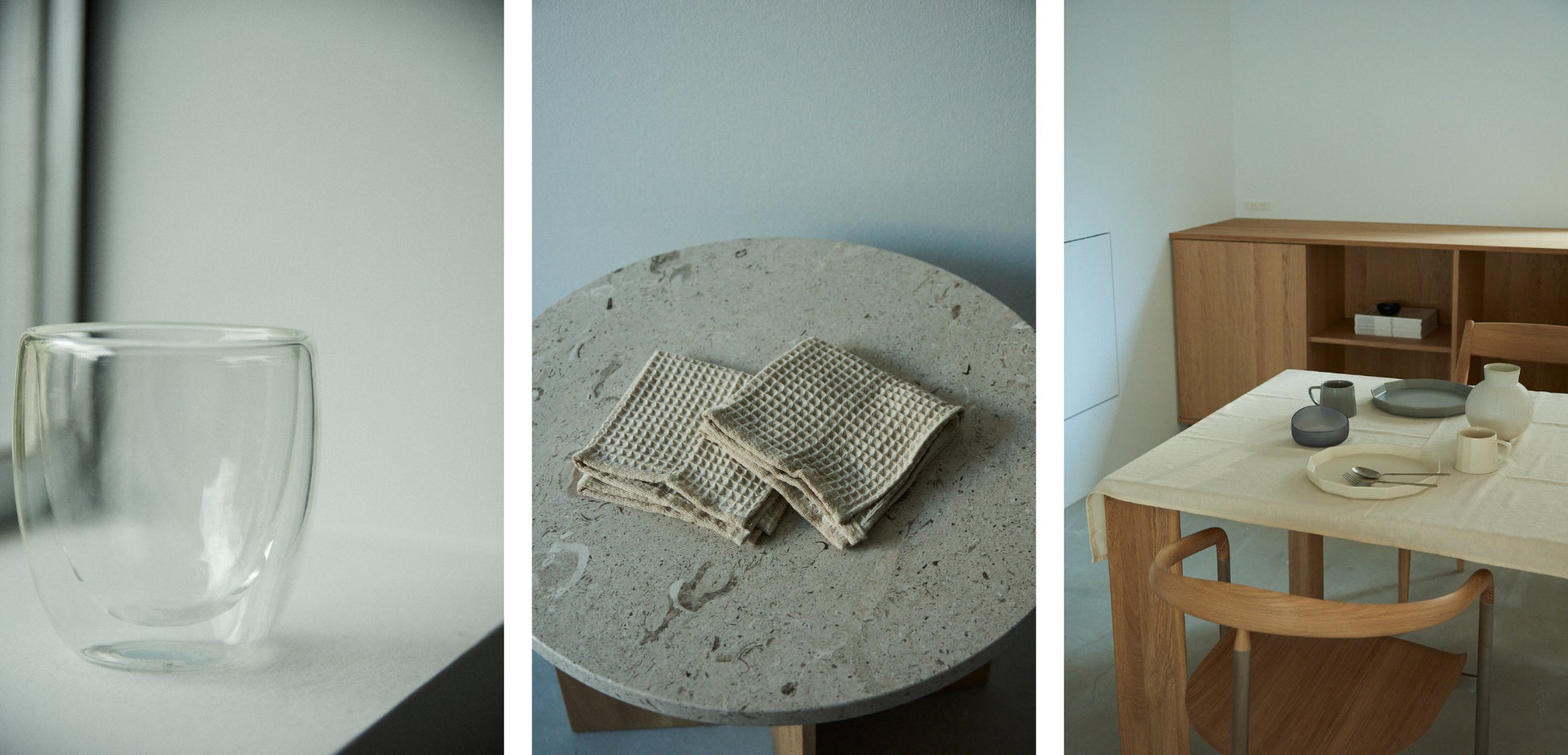 テーブルクロスやキッチンクロス、ダブルウォールグラスなど日常に使いやすいアイテムも展開。(MANOF×3COINS 330円〜880円)