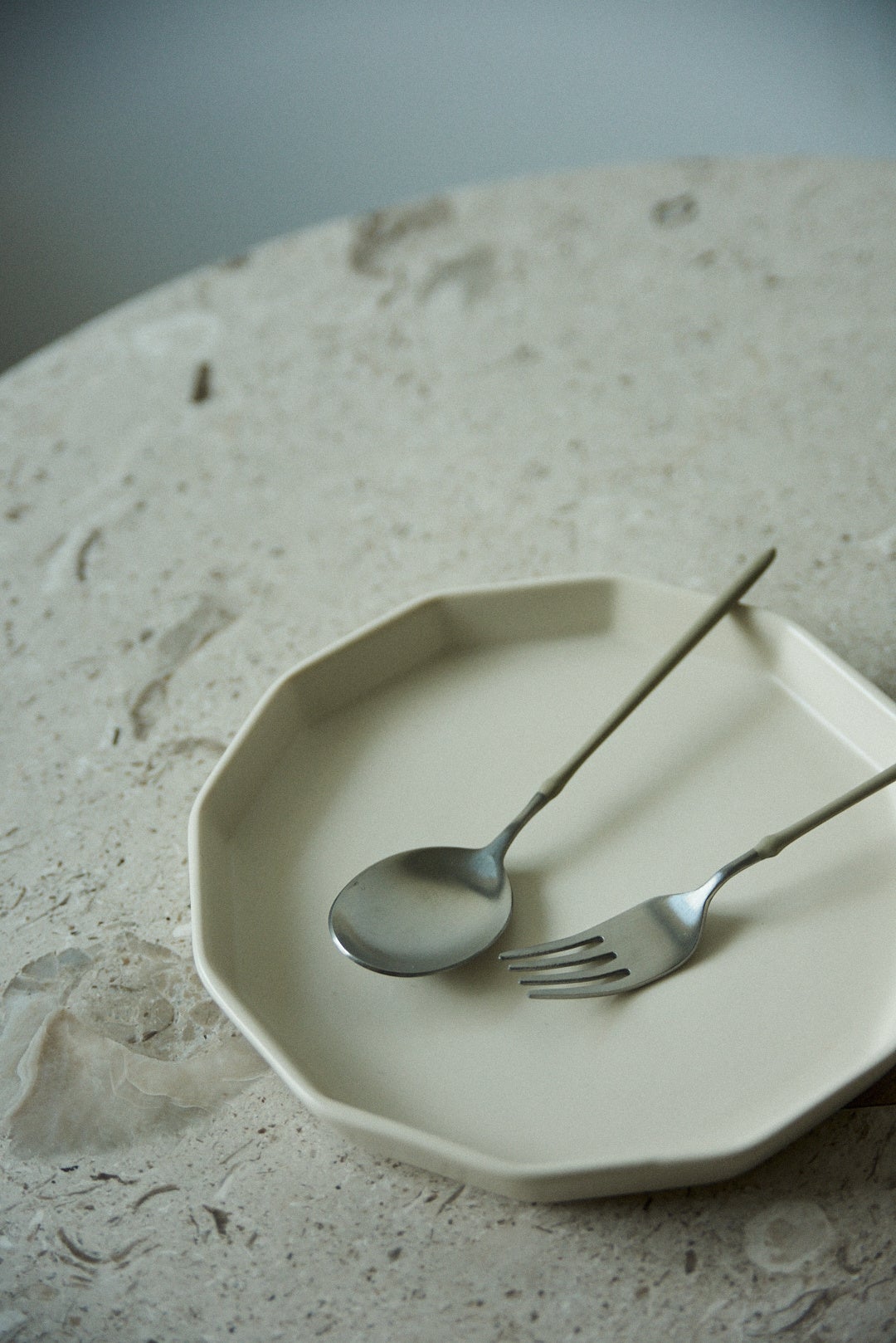 絶妙なベージュカラーのカトラリーはボリューム感のある先端と華奢な柄のバランスに拘りました。