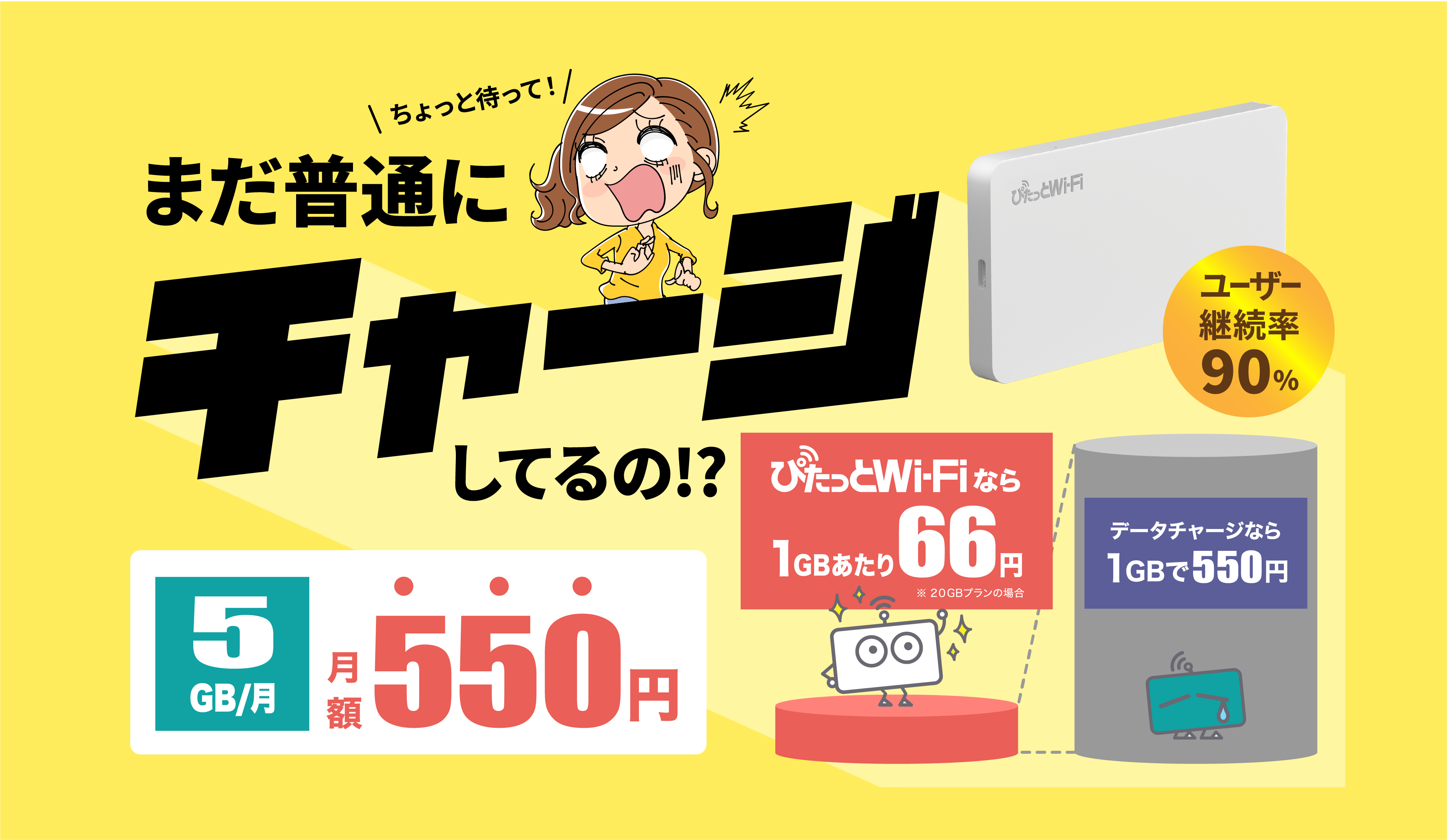 データチャージは1GB 550円以上が標準ですが、ぴたっとWi-Fiでしたら同じ値段で5GBご利用いただけます。