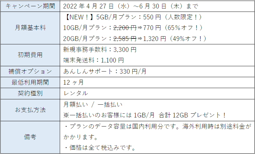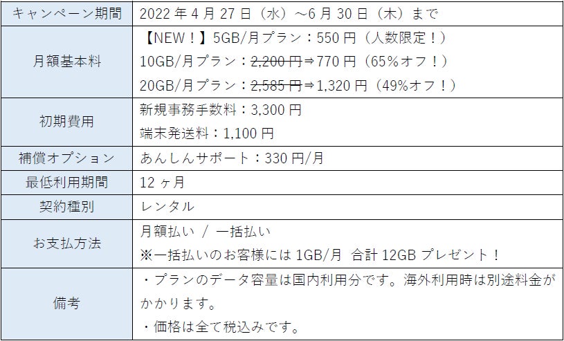 株式会社en service(本社:東京都新宿区、代表取締役:小林 達也)は、国内・海外兼用のWi-Fiルーター『ぴたっとWi-Fi』にて、5GB/月を月額550円でご利用いただける「低容量ダントツキャンペーン」を、2022年4月27日(水)より開始しました。その他に10GB/月プラン・20GB/月プランも定価より最大65%オフと、お得にご利用いただけます。