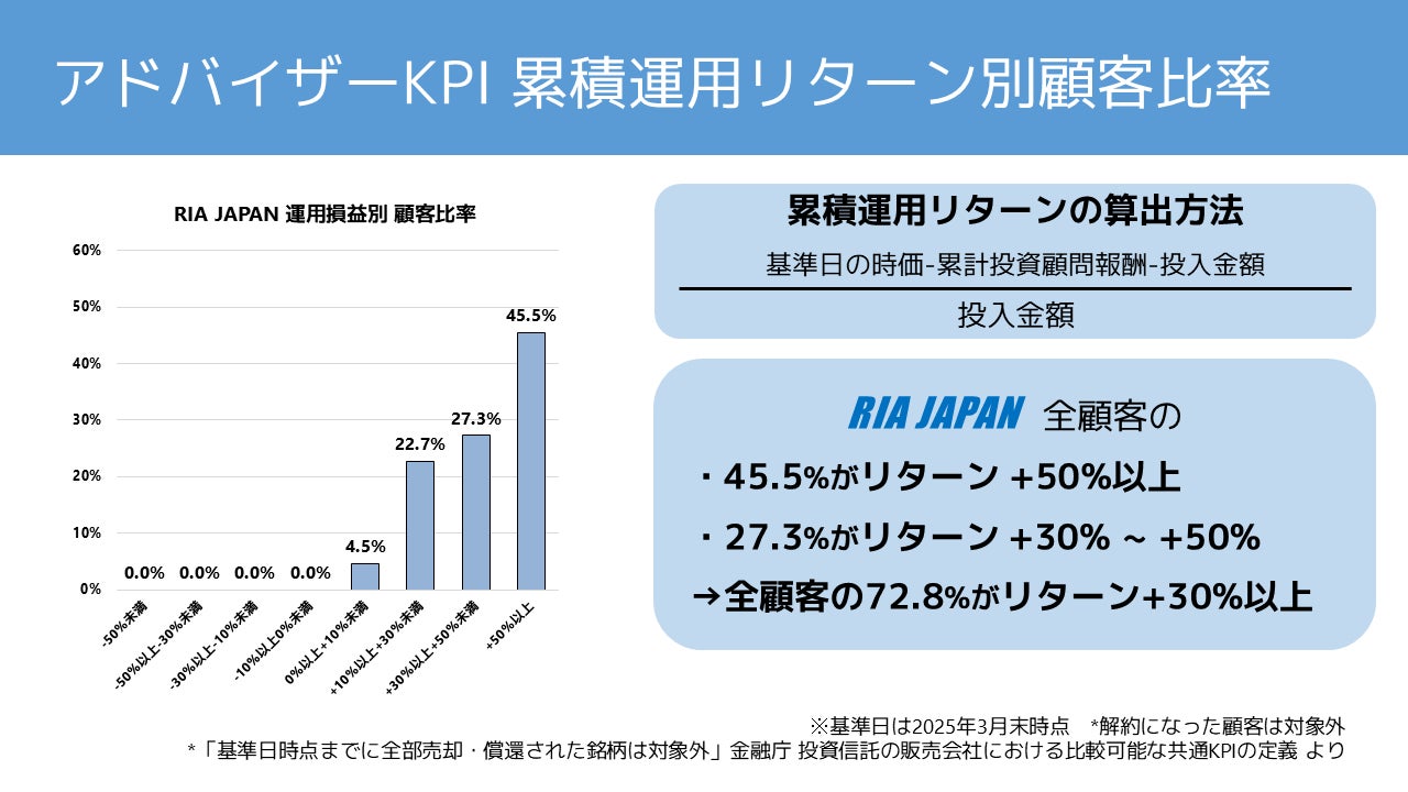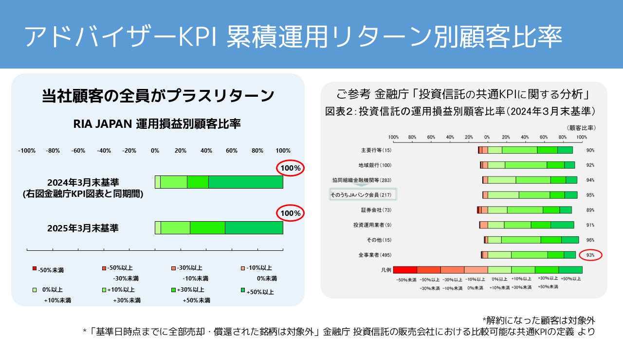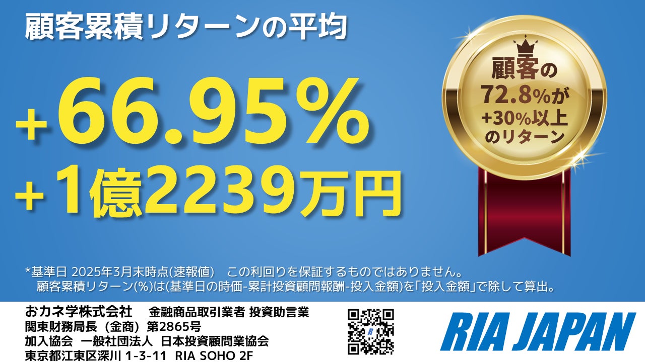 RIA JAPAN(投資助言業)、顧客累積リターン平均66.95%、元本割れゼロ 2025年3月末「アドバイザーKPI」を公表