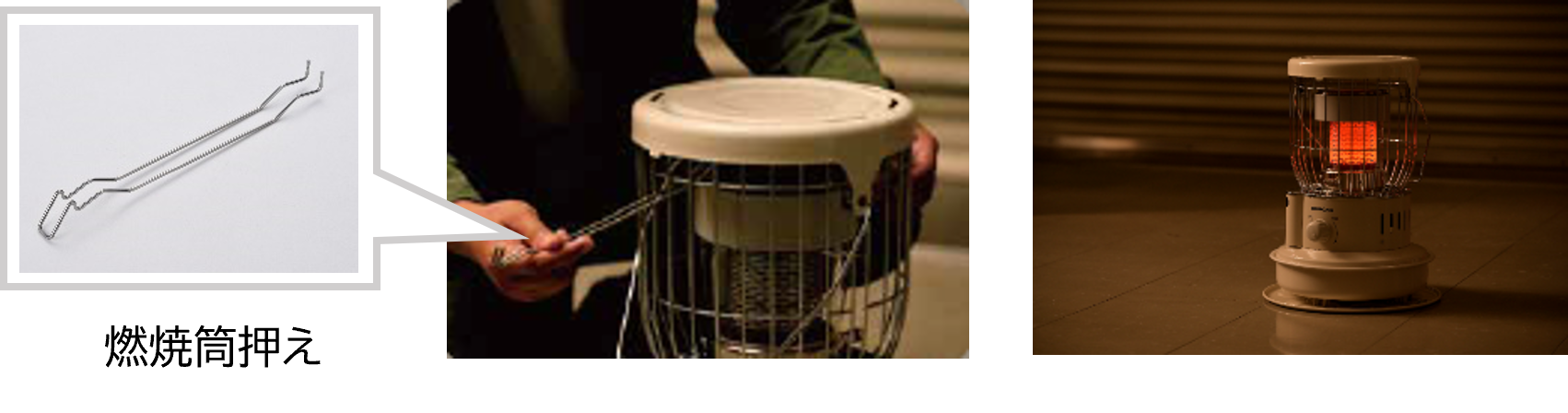 高さ約47cmのコンパクトボディに加え、運搬時に燃焼筒のぐらつきを防止する「燃焼筒押え」を付属していて、持ち運びのしやすさは抜群。点火用ライターで点火※5をするため、電源が不要で使用場所を選ばず、停電等の災害時にも活躍します。