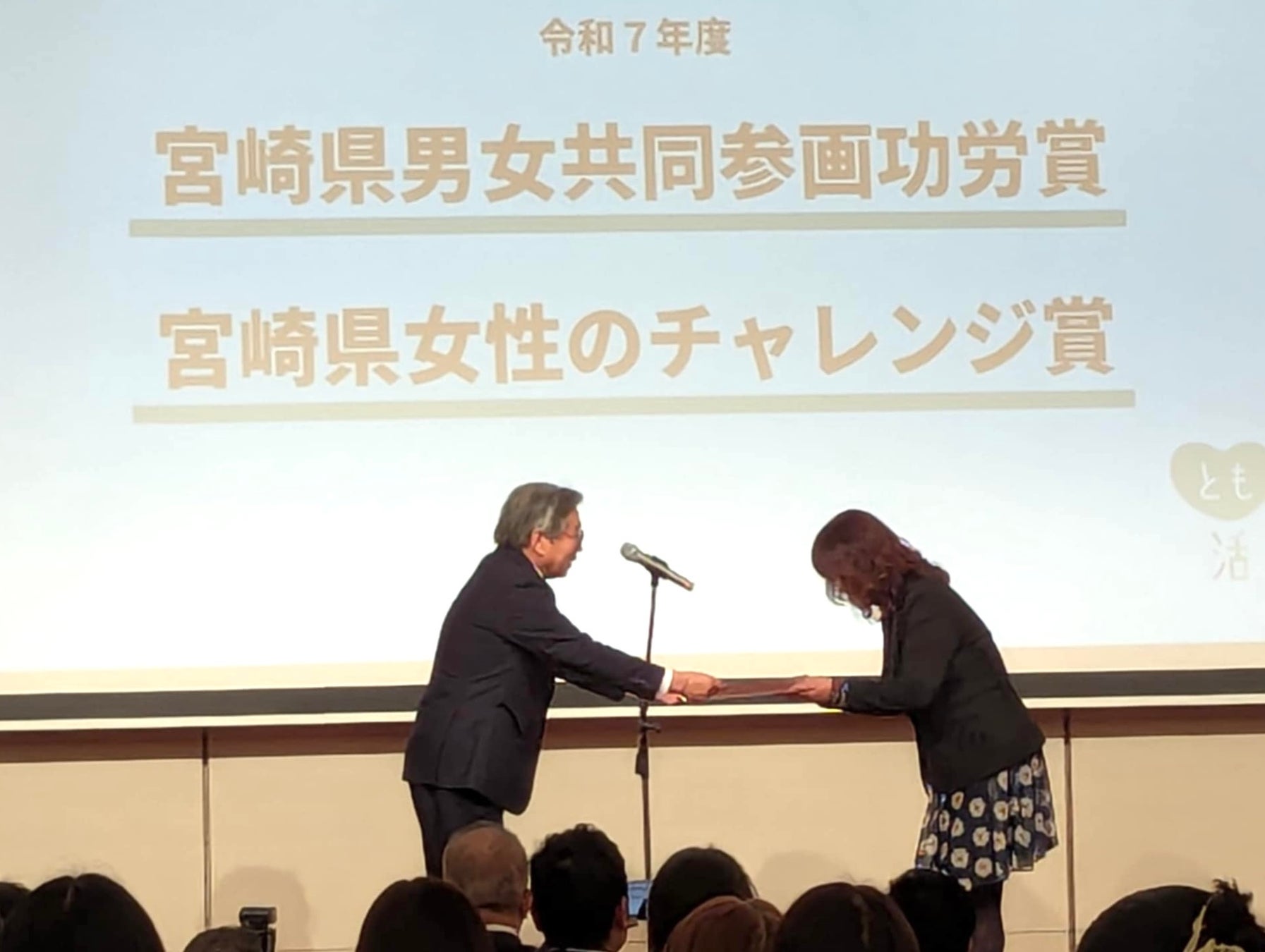 「男女共同参画功労賞」は、宮崎県の男女共同参画施策において最も功労のあった人物に贈られるものです。加納は、令和7年11月19日(水)に宮崎市で開催された「ひなたの『とも活』推進大会」にパネリストとして参加した後、第2部の表彰式に出席いたしました。