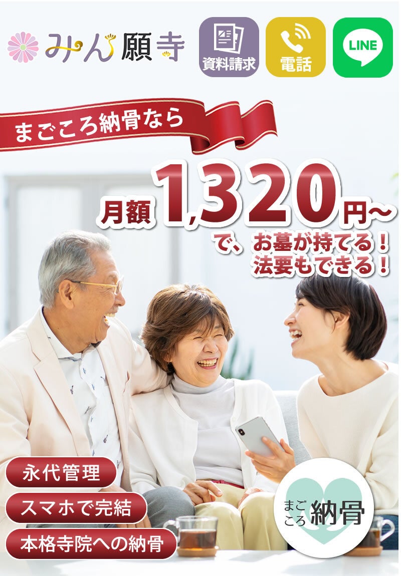 当社は、マインドケアプラットフォーム、スマホのお寺「みん願寺」を8月2日より提供開始し、その第二弾として、お墓のサブスク「まごころ納骨」をリリースいたします。「まごころ納骨」では、大切な人のお墓を月額1,320円から本格寺院の納骨庫に納め、オンライン法要でご供養いたします。