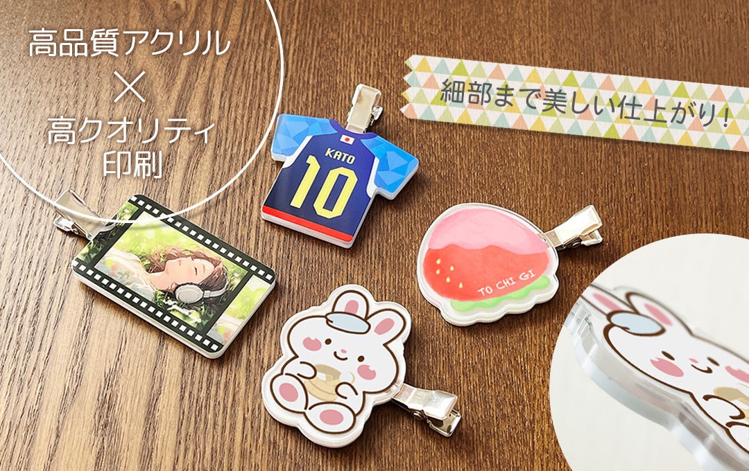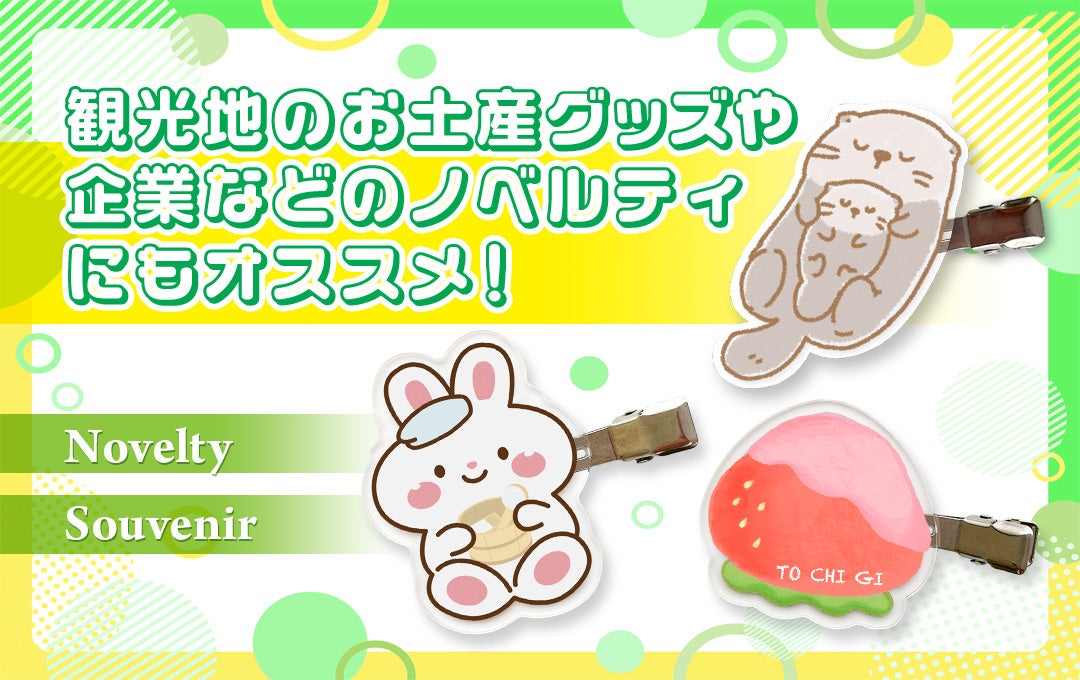 オリジナルアクリルヘアクリップは、さまざまなシーンで活躍できるアイテムです。アニメ・漫画・ゲームなどのキャラクターグッズや、人気タレントやアーティストのライブグッズ、プロスポーツチームの公式グッズやテーマパーク・ご当地キャラのオリジナルグッズとしてもおすすめです。、個性的なデザインが映えるオリジナルグッズを作成できます。実用性が高く、幅広い層に喜ばれるため、ショップブランドのオリジナルグッズとしてはもちろん、企業のノベルティにも最適です。