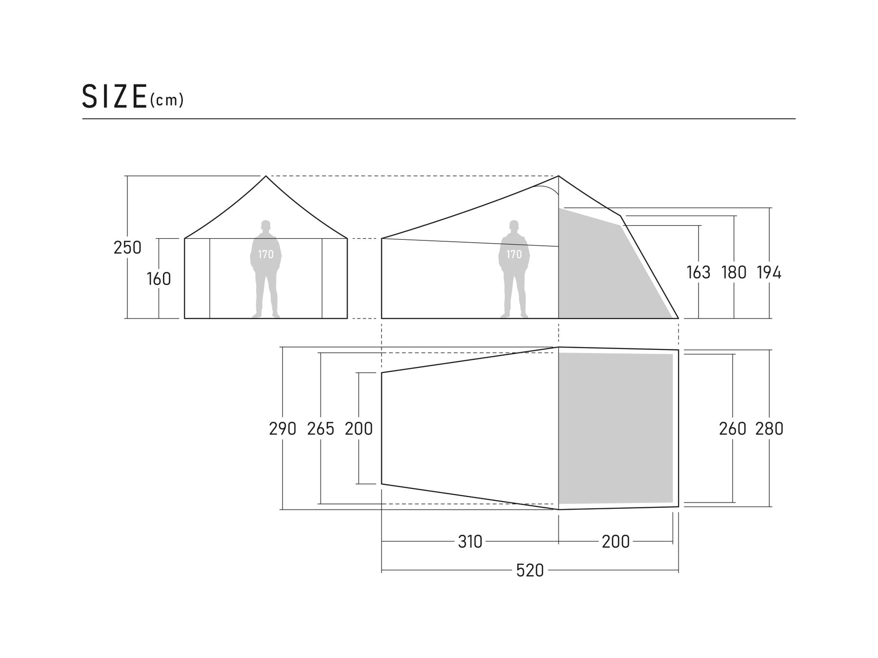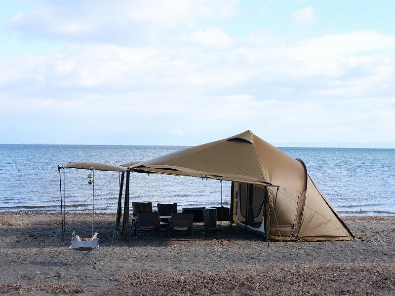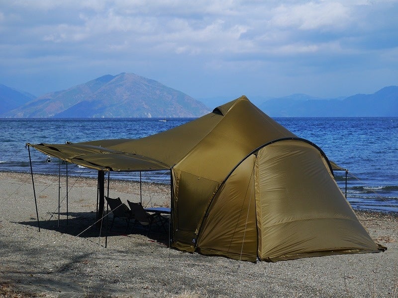 高さ250cmのセンターポールを中心に後方はアーチポールで空間を作り、前方は4本のモノポールで構成することでテント内にいても死角なく外の景色を堪能できます。