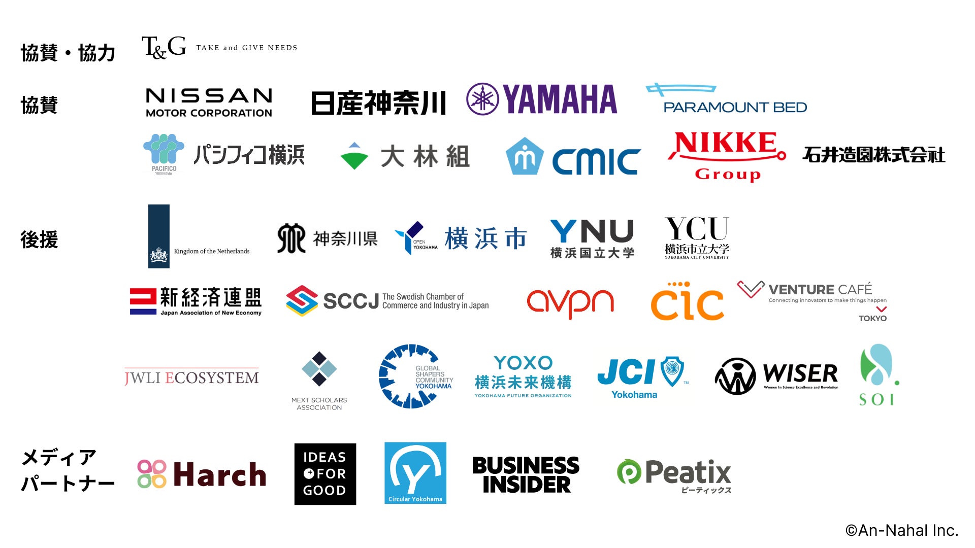 後援:オランダ王国大使館、神奈川県、横浜市、国立大学法人横浜国立大学、公立大学法人横浜市立大学、一般社団法人新経済連盟、SCCJ 在日スウェーデン商工会議所、AVPN Limited, CIC Japan合同会社、一般社団法人ベンチャー・カフェ東京、JWLI(Japanese Women's Leadership Initiative)、文部科学省国費留学生協会 、Global Shapers Community 横浜ハブ、横浜未来機構、横浜青年会議所、WISER、株式会社ソーイ