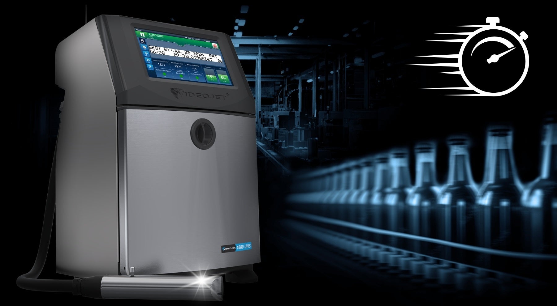 最高 508 m /分の生産ラインに追従。飲料を大量生産するラインなどで超高速印字を行う場合に最適