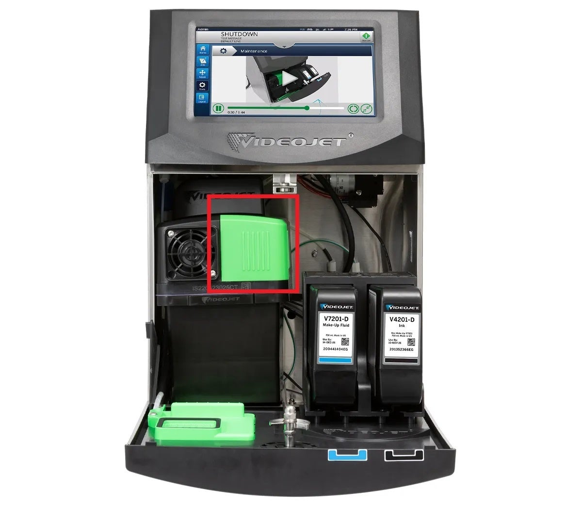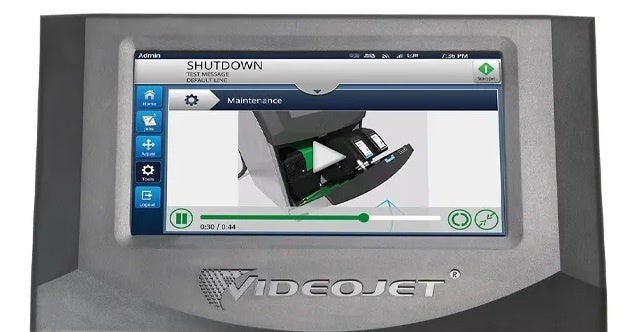 VJ1880 シリーズにはメンテナンスを簡単にする工夫が施されており、スタッフの経験値がまちまちである場合にも利用を検討頂けます。プリンタ本体のタッチパネル上では、プリンタにまつわる作業手順を動画で確認できます。1年に1回程度の予防メンテナンスは、色分けされた1つの「サービスモジュール」のボルトを外して交換するだけであるため非常に簡単。お客様ご自身で数分で完了できます(メンテナンス時にプリンタ内のインクを排出する必要はありません)。さらに、印字ヘッド内部の汚れを洗浄するために、ボタンを押すだけで開始できるヘッド内部の自動洗浄(オートリンス)機能をご利用いただけます。