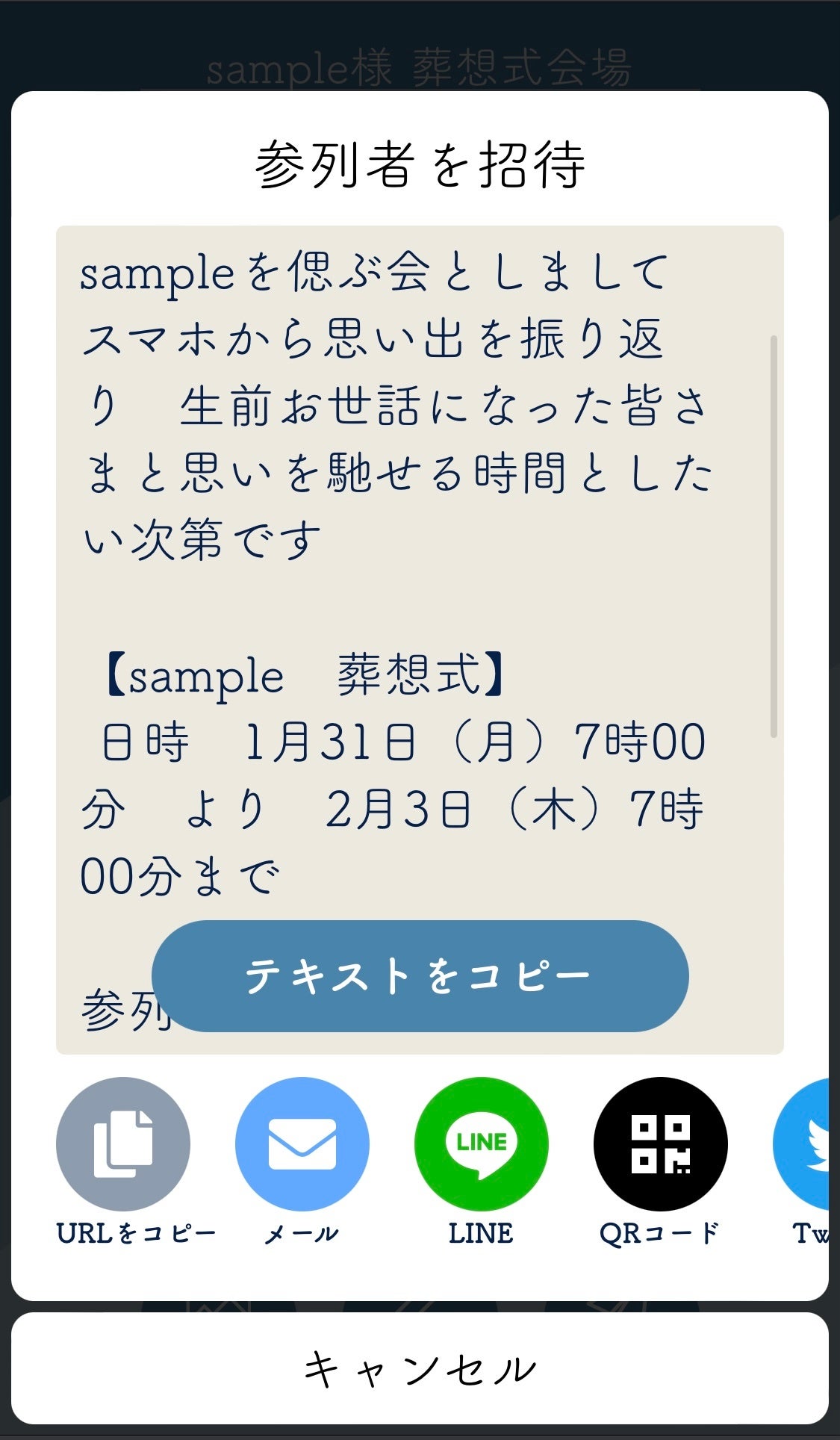 招待では、LINEやメールなどを用いてメッセージを送ります。招待文のテンプレートがございますので適宜編集してお使いいただけます。また、参列者がさらに参列者を招待することも可能です。ご友人に頼んで、ご自身が連絡先を知らないご友人などにも招待をお送りいただくことが可能です。