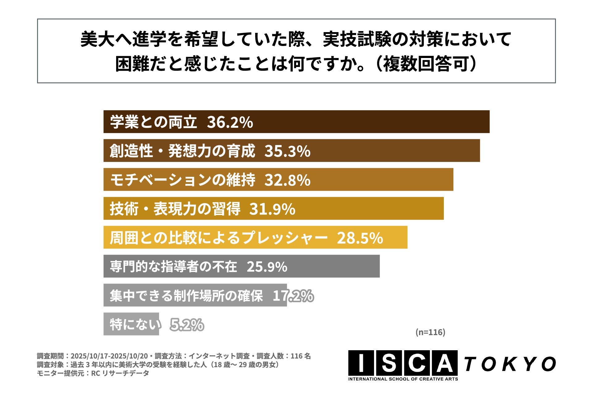 続いて、「美大へ進学を希望していた際、実技試験の対策において困難だと感じたことは何か」を尋ねる設問への回答では、1位が「学業との両立」で36.2%、2位が「創造性・発想力の育成」で35.3%、3位が「モチベーションの維持」で32.8%という結果になりました。この結果から、過去3年以内に美大の受験を経験した人が美大へ進学を希望していた際、実技試験の対策において主に困難だと感じたことは「学業との両立」や「創造性・発想力の育成」であったことがわかりました。
