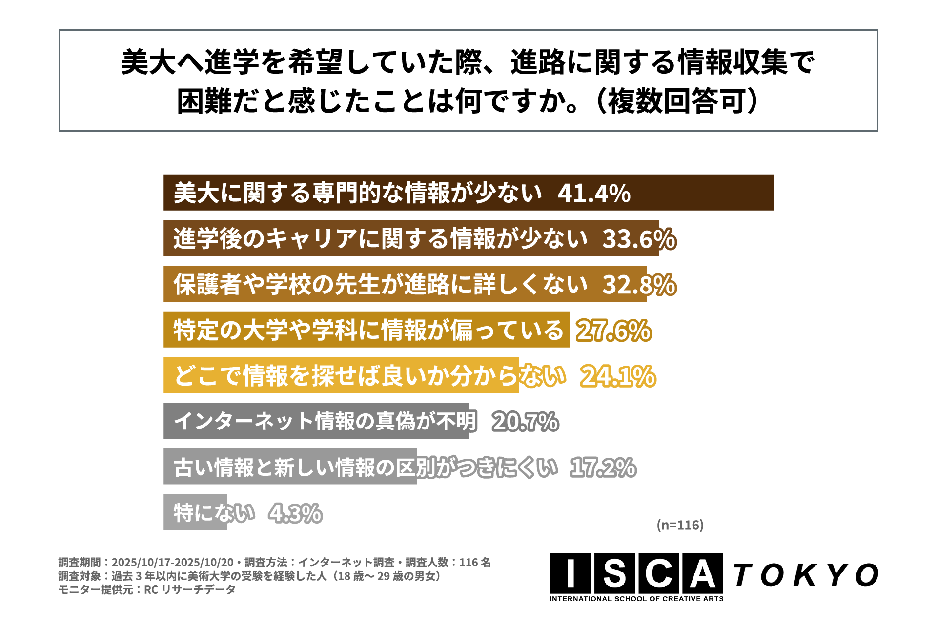 また、過去3年以内に美大の受験を経験した人を対象に、「美大へ進学を希望していた際、進路に関する情報収集で困難だと感じたことは何か」を尋ねる設問への回答では、1位が「美大に関する専門的な情報が少ない」で41.4%、2位が「進学後のキャリアに関する情報が少ない」で33.6%、3位が「保護者や学校の先生が進路に詳しくない」で32.8%という結果になりました。また、4位以降も回答率20%を超える回答が複数並ぶ形となり、「特定の大学や学科に情報が偏っている」ことや「どこで情報を探せば良いか分からない」、「インターネット情報の真偽が不明」といったことも、美大へ進学を希望していた際の進路に関する情報収集で困難だと感じられていたことが判明しました。