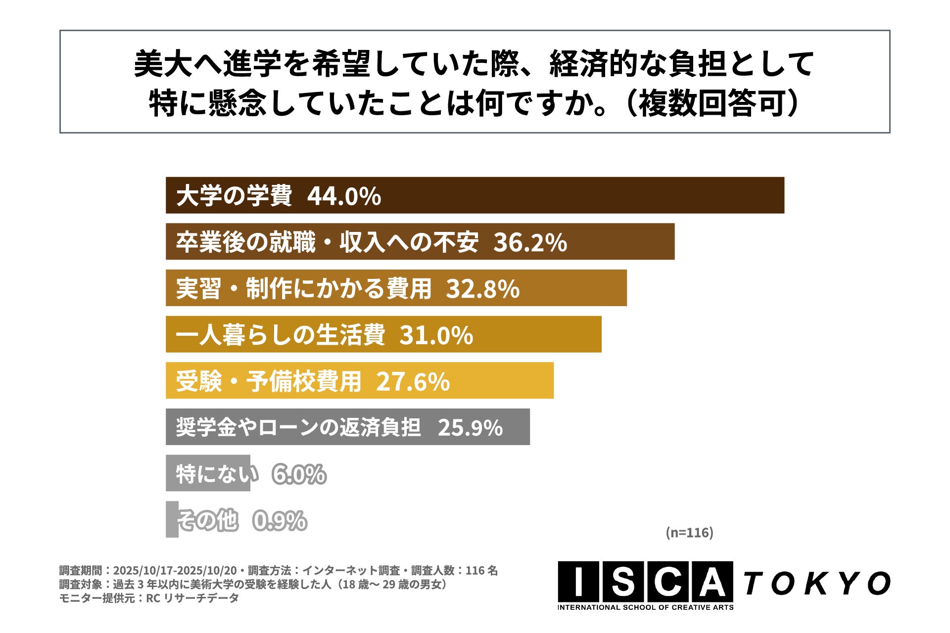 調査の最後、「美大へ進学を希望していた際、経済的な負担として特に懸念していたことは何か」を尋ねる設問への回答では、1位が「大学の学費」で44.0%、2位が「卒業後の就職・収入への不安」で36.2%、3位が「実習・制作にかかる費用」で32.8%という結果になりました。この結果から、過去3年以内に美大の受験を経験した人の多くは、経済的な負担として「大学の学費」や「実習・制作にかかる費用」といった在学中の出費に加え、「卒業後の就職・収入」といった長期的な視点でも経済的な懸念を感じていたことが判明しました。
