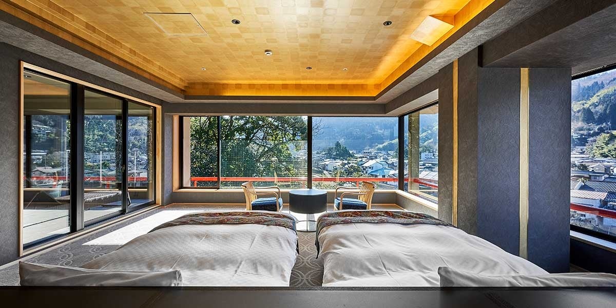 和の安らぎと洋の機能性を融合した空間。中層階の角部屋では、三朝温泉街を臨むパノラマビューをご堪能いただけます。室内は、天然温泉露天風呂を楽しむデッキテラス、洋のリビングスペースに加えて、和の落ち着きを感じさせるベッドルームをご用意しています。