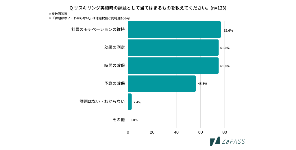 リスキリング実施時の課題を尋ねたところ、「社員のモチベーションの維持」が62.6%で最も多く、「効果の測定」と「時間の確保」がそれぞれ61.0%と続きました。(n=123)