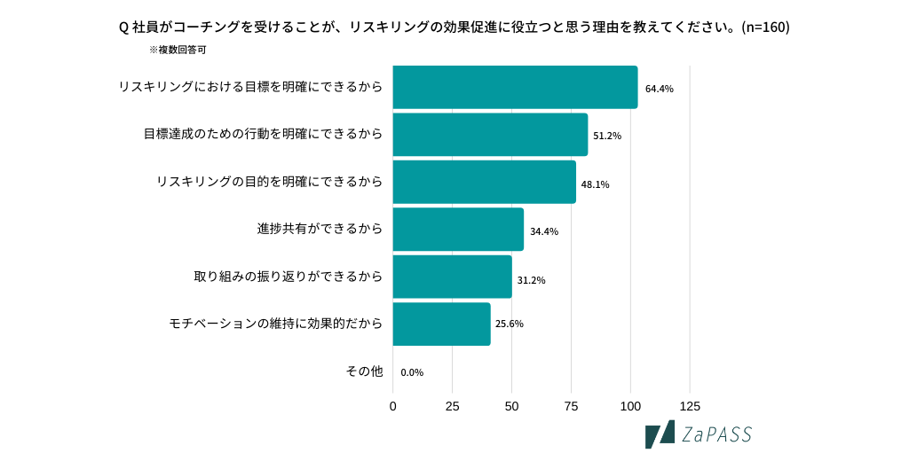 コーチングがリスキリングの効果促進に役立つと思う理由を尋ねたところ、「リスキリングにおける目標を明確にできるから」が64.4%と最も多く、「目標達成のための行動を明確にできるから」が51.2%、「リスキリングの目的を明確にできるから」が48.1%と続きました。(n=160)