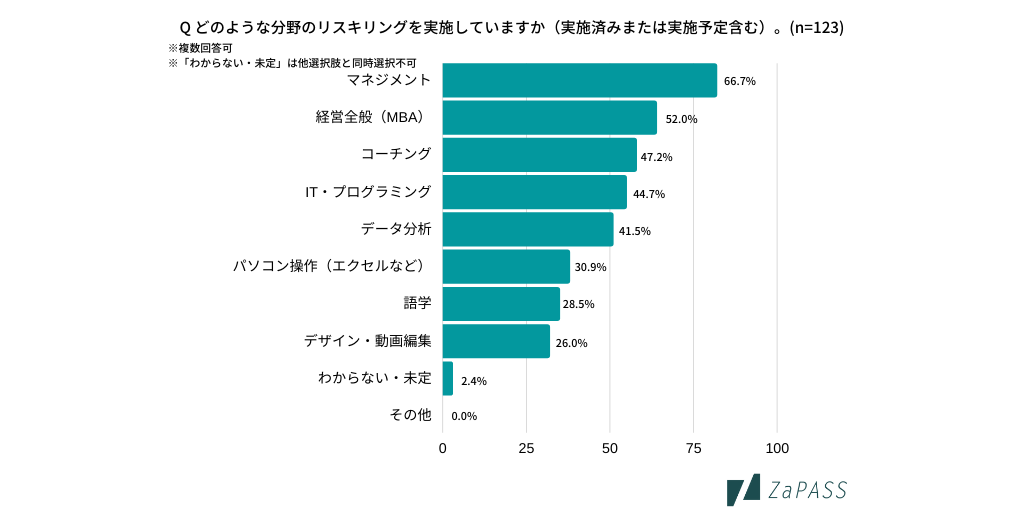 どのような分野のリスキリングを実施しているかあるか尋ねたところ、「マネジメント」が66.7%で最も多く、「経営全般(MBA)」が52.0%、「コーチング」が47.2%と続きました。(n=123)