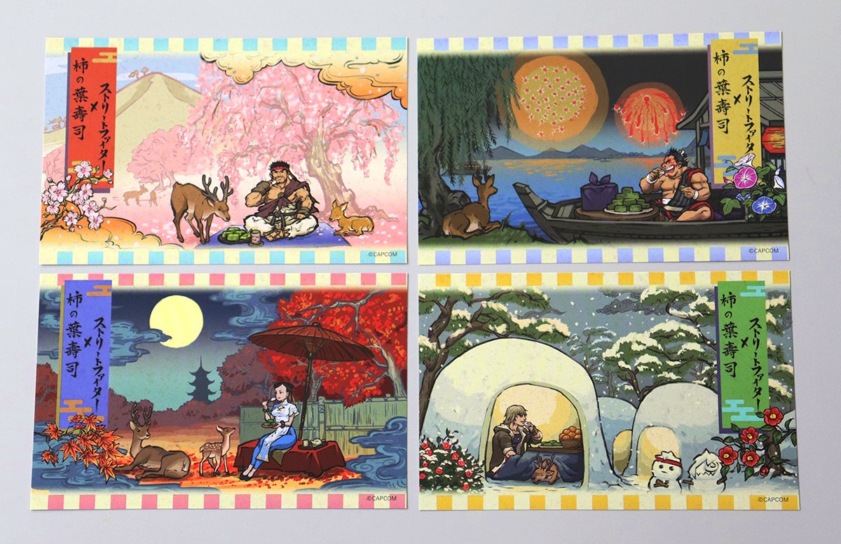 今回の商品では、「リュウ」「エドモンド本田」「春麗」「ケン」が登場。一人ずつ描いた描き下ろしイラストを蓋にデザインした計4種類の商品を展開します。奈良らしく、柿の葉寿司を頬張る4人のそばには鹿がたたずむ和風なファイター達。春夏秋冬の特徴的な背景と、ファイター達の表情は必見です!