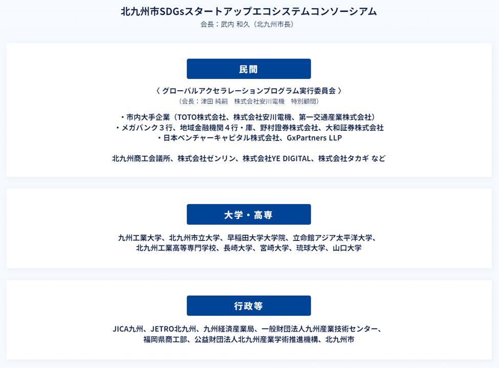 GAP-K実行委員会(会長 津田純嗣㈱安川電機 特別顧問)は、TOTO㈱、㈱安川電機、第一交通産業㈱など地元大企業、金融機関等14社で構成する民間組織であり、「北九州市SDGsスタートアップエコシステムコンソーシアム」※に参画しています。
