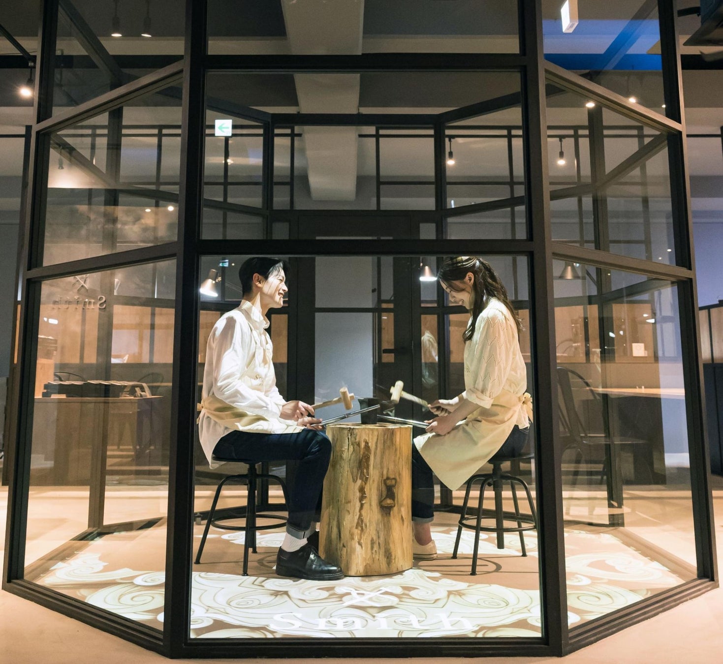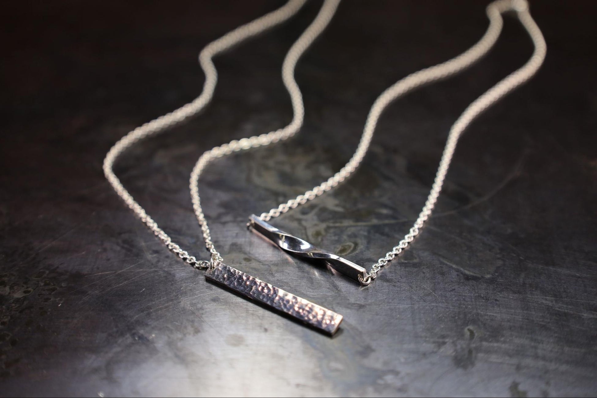 シルバー素材の表面をリューターで磨き、ハンマーで叩くなど加工を施し、自分だけのオリジナルネックレスを制作できるワークショップです。シンプルなフォルムのバータイプネックレスは、装いのアクセントとして首元をキラッと華やかに見せてくれます。もちろんペアで手作りネックレスを制作することも可能です。 |