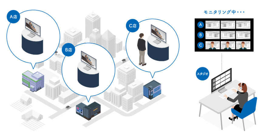 複数拠点を同時監視しながら、各拠点と遠隔接客(通話)ができるビーツの自社開発サービスです。