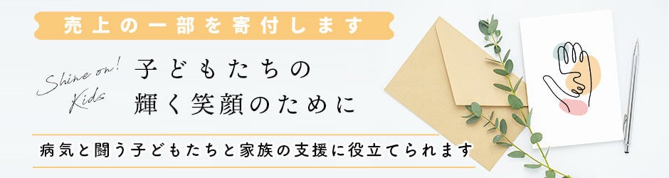 サステナブルマーケットページ内の商品の売り上げの一部を寄付し、「小児がん、重い病気と闘う子どもたちと家族の支援(https://ja.sokids.org/)」の活動に役立てられます。