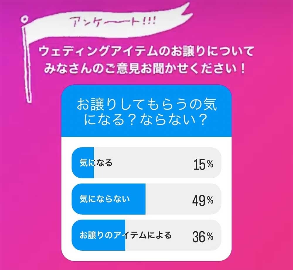 さらに、結婚式アイテムのお譲りについてアンケートを取ったところ、「気にならない」という花嫁さんも増えており、全て新品で揃えたいという方ばかりではないことも分かりました。