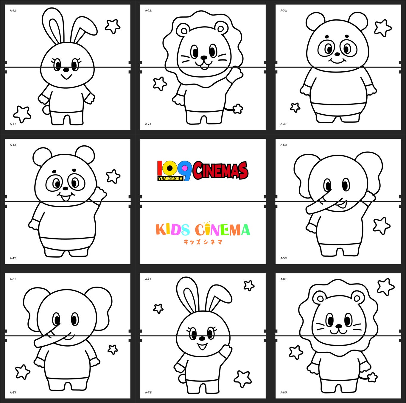 109シネマズゆめが丘の「KIDS CINEMA」前のキッズスペースで、映画鑑賞前にオリジナルキャラクターのぬり絵をしていただくと、上映終了後に自身のぬり絵が「FLAP DISPLAY」に登場します。